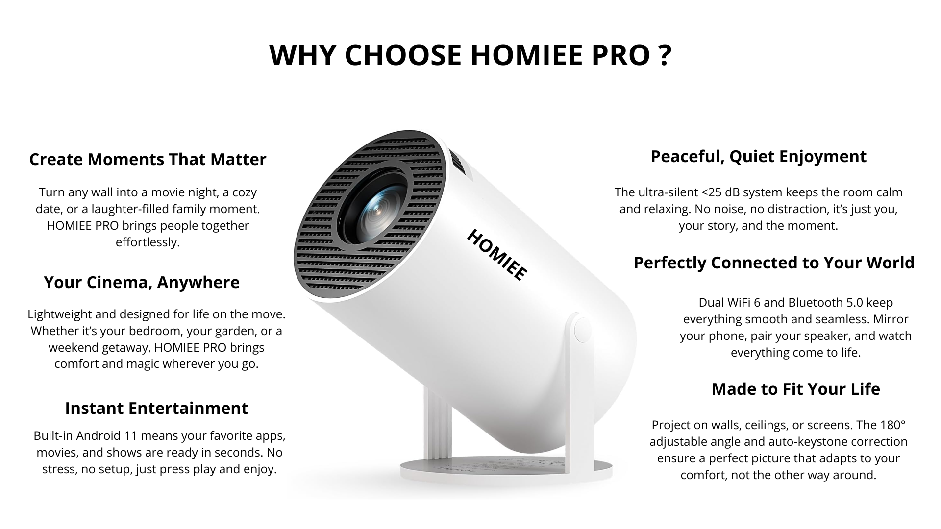 Experience next-level entertainment with the HOMIEE PRO, the ultra-compact smart projector designed to turn any room into a personal home theater. With its modern design, built-in Android 11, 180° rotation, and effortless connectivity, it delivers immersive viewing anywhere you want.